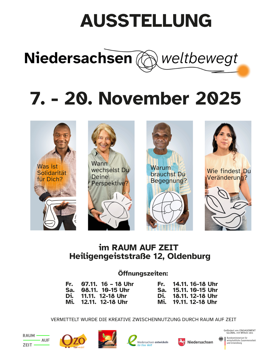 AKTUELL: 7.- 20.11.2025 Ausstellung „Niedersachsen WELTBEWEGT“ voN Ökumenisches Zentrum Oldenburg e.V. (ÖZO) Oldenburg // IM RAUM AUF ZEIT, HEILIGENGEISTSTR. 12