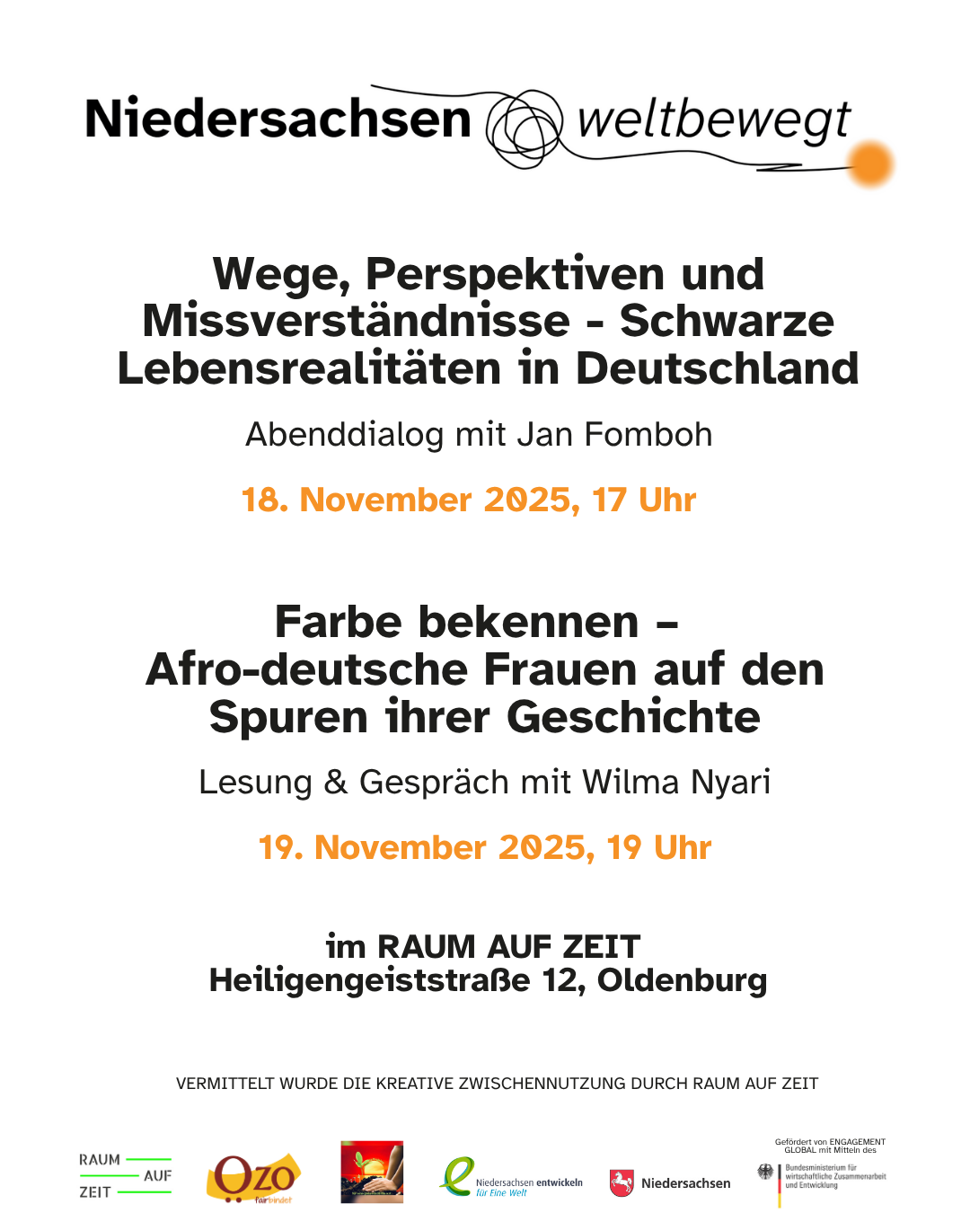 Thema: „Wege, Perspektiven und Missverständnisse – Schwarze Lebensrealitäten in Deutschland“ Ort: RAUM AUF ZEIT, Heiligengeiststr. 12, 26121 Oldenburg